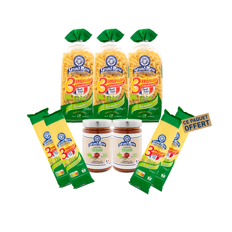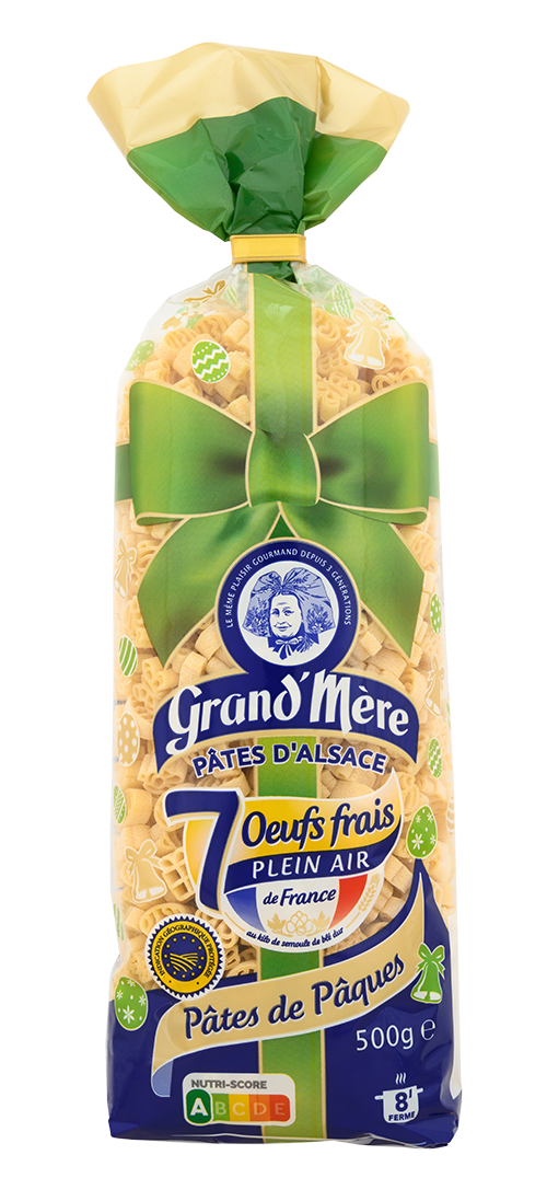 Depuis 4 générations, Pâtes Grand’Mère est un fabricant de pâtes alsaciennes, désormais labellisé Alsace Excellence. Il s’agit par ailleurs d’une des dernières entreprises familiales indépendantes françaises produisant des pâtes alimentaires. L’ensemble de nos pâtes d’Alsace (spaghetti, spaetzle, macaroni, penne et bien plus encore) est élaboré dans le strict respect de l’authentique recette alsacienne, transmise par des générations de mères et de grands-mères et toujours autant appréciée par les amateurs de pâtes : un kilo de semoule de blé dur et 7 œufs frais plein air de France. Grâce à l’alliance d’ingrédients français de haute qualité et de procédés de fabrication inspirés du façonnage traditionnel, notre gamme “Terroir” de pâtes aux œufs frais propose notamment de retrouver la texture, le goût et la tenue en bouche typique des pâtes à l’ancienne. Pour satisfaire tous les goûts, Grand’Mère propose un vaste assortiment de pâtes courtes (coquillettes, torsades, papillon…) ou longues (tagliatelles, linguine…) et de spécialités alsaciennes telles que les spaetzle ou les knepfle. Parcourez dès maintenant la gamme Grand’Mère et procédez à votre achat de pâtes en ligne.